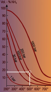 Die Tatsache, dass mit steigender Temperatur die Ausbeute an Ammoniak geringer wird, ist damit zu erklären, dass die Bildung von Ammoniak aus den Elementen ein exothermer, die Spaltung dagegen ein endothermer, also ein wärmeverbrauchender Vorgang ist. So wird bei großer Hitze der Bildung von Ammoniak entgegengewirkt, da die Spaltung während der Gleichgewichtreaktion begünstigt wird. Das Gleichgewicht wird nach links verschoben und die Konzentration von Ammoniak verringert sich.