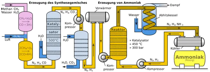 Die Ammoniaksynthese bietet also die enorm wichtige Möglichkeit, den Stickstoff der Luft in eine chemische Verbindung einzubauen. Auf dieser Grundlage können andere Synthesen durchgeführt werden, z. B. das Ostwaldverfahren zur Gewinnung von Salpetersäure, von Mineraldüngern, von Kunst- und Farbstoffen.