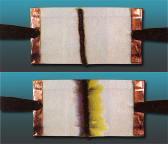 Im Versuch sind die Kupfer-Ionen an der blauen Farbe zu erkennen (die durch die Ammoniakmoleküle $ \mathrm { NH_{3} } $ des Ammoniakwassers hervorgerufen wird). Das Chromat-Ion ($ \mathrm { CrO_{4 \ (aq)}^{2-} } $) erkennt man an der gelben Farbe. Schaltet man den Gleichstrom ein, dann entspringt aus dem Wollfaden ein blauer und ein gelber Fleck, beide wandern zu jeweils einem der beiden Kupferbleche. Der gelbe Fleck wird durch die Chromat-Ionen verursacht, der blaue Fleck durch die Kupfer-Ionen.