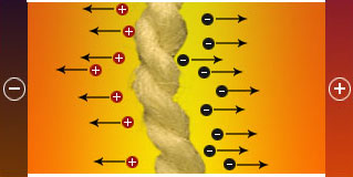 Beim Einschalten des Gleichstroms wird eins der Kupferbleche zur positiv geladenen Anode, das andere zur negativ geladenen Kathode. Da sowohl Kathode als auch Anode den elektrischen Strom leiten, bezeichnet man beide als Elektroden. Zwischen ihnen besteht ein elektrisches Feld. Wegen der Anziehungskräfte, die zwischen entgegengesetzten Ladungen bestehen, werden die Kationen von der negativ geladenen Kathode angezogen und umgekehrt die Anionen von der Anode. Der Stromtransport in Lösungen von Ionenverbindungen beruht also auf der Wanderung der Ionen.