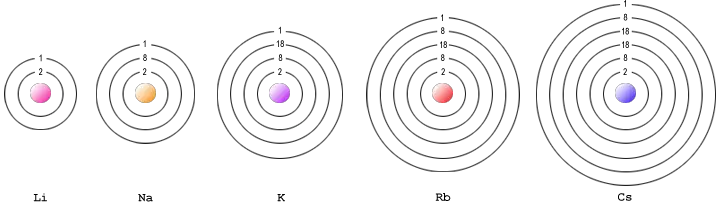 Der Atombau von Natrium und Kalium erklärt das unterschiedliche Verhalten beider Elemente, so hat Natrium einen kleineren Atomradius als Kalium, weshalb die Protonen des Natriums auf das Außenelektron eine stärkere Anziehung ausüben als die des Kaliums. Je leichter aber die Elektronen aus der Atomhülle herausgerissen werden können, desto eher können sie sich an chemischen Reaktionen beteiligen. Umgekehrt wird eine chemische Reaktion auch begünstigt, je leichter Elektronen eingefangen werden können, wie es beispielsweise bei den Halogenen der Fall ist. Reaktionen zwischen Halogenen und Alkalimetallen verlaufen deshalb besonders heftig.