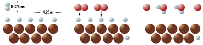 Links:An der Oberfläche des Platins zerbrechen die Wasserstoffmoleküle zu Wasserstoffatomen. Mitte: Sauerstoffmoleküle nähern sich den Wasserstoffatomen. Rechts: Wasserstoff- und Sauerstoffatome haben sich teilweise zu Wassermolekülen verbunden.