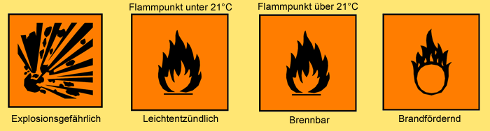 (3) „Flamme“ entfällt im Allgemeinen bei Explosionsgefahr[11], aber auch zwei Piktogramme für Kategorien besonderer Gefahren (organische Peroxide Typ B, selbstzersetzliche Stoffe und Gemische Typ B)