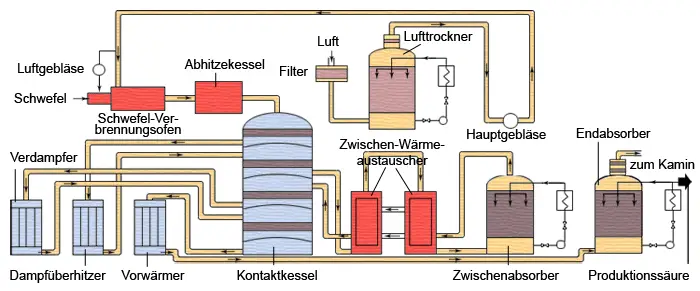 Grundstoff für die Schwefelsäureherstellung ist häufig elementarer Schwefel, der in großen Mengen (2007: 66 Millionen Tonnen) bei der Entschwefelung von Erdgas und Rohöl anfällt und nach dem Claus-Prozess aufgearbeitet wird oder nach dem Frasch-Verfahren abgebaut wird. Dieser wird an der Luft verbrannt, um Schwefeldioxid als Ausgangsstoff für die eigentliche Darstellung zu gewinnen.
