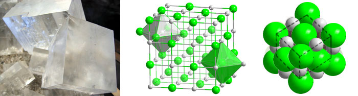 Zwischen den entgegengesetzt geladenen Ionen eines Salzes bestehen elektrostatische Anziehungskräfte, die man Coulombkräfte nennt. Sie wirken nach allen Seiten gleichmäßig, was zur Folge hat, dass sich die Ionen in bestimmter Weise räumlich anordnen. Diese räumliche Anordnung bezeichnet man im Allgemeinen als Kristallgitter. Bei den beiden Fällen oben handelt es sich um eine Ionengitter, da die Gitterpunkte von Ionen besetzt sind. Kristallgitter gibt es in sehr unterschiedlichen Erscheinungsformen. Die Lehre der Kristalle nennt man Kristallographie.