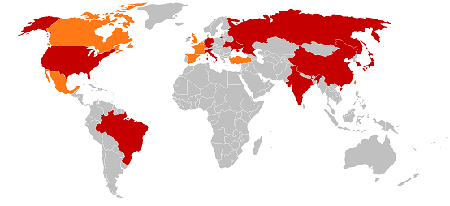 Die 10 größten Stahlproduzenten (rot) und weitere Länder, deren jährliche Stahlproduktion über 10 Millionen Tonnen liegt (Stand 2004).