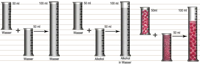 Rechts: Gleiche Mengen Alkohol und Wasser werden vermischt.