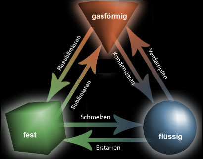In seinem festen Aggregatzustand besitzt ein Stoff eine Form, denn die Teilchen sind an bestimmte Orte gebunden. Deshalb können sie sich nur in Form einer Pendelschwingung auf ihren Plätzen bewegen. Beim Abkühlen wird diese Schwingung immer schwächer und kommt am absoluten Nullpunkt ganz zum Stillstand. Bei der Erwärmung wird diese Bewegung wieder stärker und kann dazu führen, dass Teilchen ihre Plätze verlassen und der Stoff flüssig wird (er schmilzt). Kühlt man ab, wird der Stoff wieder fest (er erstarrt).