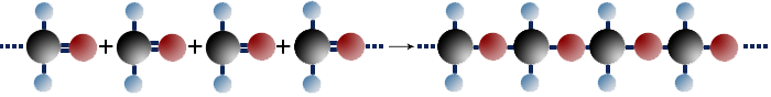 $ \mathrm { \cdots + \underbrace {H \ – \!\!\!\!\!\!\!\!\!\!\!\!\! {\overset { \qquad \ \ \qquad { \Large O}} {\overset {\qquad \ \diagup \!\! \diagup } {\underset {\qquad \qquad {\Large H} } {\underset {\qquad \diagdown }C }}}}}_{Methanal} \!\!\!\! + \; H \ – \!\!\!\!\!\!\!\!\!\!\!\!\! {\overset { \qquad \ \ \qquad { \Large O}} {\overset {\qquad \ \diagup \!\! \diagup } {\underset {\qquad \qquad {\Large H} } {\underset {\qquad \diagdown }C }}}} \!\!\!\! + \; H \ – \!\!\!\!\!\!\!\!\!\!\!\!\! {\overset { \qquad \ \ \qquad { \Large O}} {\overset {\qquad \ \diagup \!\! \diagup } {\underset {\qquad \qquad {\Large H} } {\underset {\qquad \diagdown }C }}}} \!\!\!\! + \; \cdots \ \longrightarrow \ \ \cdots \ \underbrace {{ \overset {\Large H} {\overset {|} { \underset {\Large H} {\underset {|}{C}}}}} \; – \ O \ – \ { \overset {\Large H} {\overset {|} { \underset {\Large H} {\underset {|}{C}}}}} \; – \ O \ – \ { \overset {\Large H} {\overset {|} { \underset {\Large H} {\underset {|}{C}}}}} \; – \ O \ }_{Polymethanal} \cdots }$
