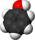 Der Schmelzpunkt von Phenol liegt bei 41 °C und der Siedepunkt bei 182 °C. Reines Phenol bildet bei Zimmertemperatur farblose Kristallnadeln und hat einen charakteristischen, aromatischen Geruch. Die Hydroxy-Gruppe des Phenols reagiert im Gegensatz zu Alkoholen sauer, ebenfalls eine wässrige Lösung von Phenol. Das Phenolmolekül kann also Wasserstoff-Ionen abgeben und ist somit eine Säure .