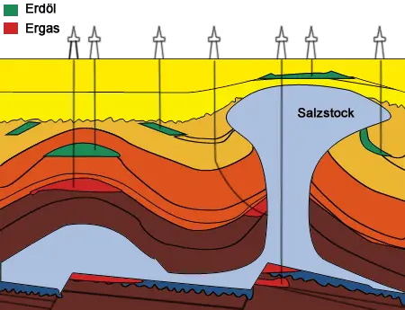 Das entstandene Erdöl ist leichter als Wasser und kann innerhalb der Poren von Gesteinen wandern. Diesen Prozess nennt man Migration. In sogenannten Speichergesteinen sammeln sich die umgewandelten Kohlenwasserstoffe als Erdöl und Erdgas in Form kleiner Tröpfchen wie Wasser in einen Schwamm an. Gerät das Erdöl unter undurchlässige Gesteinsschichten, die seine weitere Wanderung an die Erdoberfläche und seitwärts verhindern (Erdölfalle), reichert es sich dort an und es entsteht eine Erdöllagerstätte. In den Gesteinsporen befinden sich neben Erdöl auch Lagerstättenwasser und Erdgas. Es entsteht zusammen mit Erdöl unter sehr ähnlichen Bedingungen und bildet über Erdöllagerstätten oft eine sogenannte Gaskappe. Kommt Erdöl durch tektonische Verschiebungen der Erdoberfläche nach oben, dann bilden sich unter der Einwirkung von Luftsauerstoff harzartige Produkte und es entsteht natürlicher Asphalt. Ein Beispiel dafür sind die Teergruben von La Brea in Los Angeles, in der viele Überreste prähistorischer Tiere gefunden wurden. Bild 1 zeigt den geologischen Aufbau typischer Erdöl- und Erdgaslagerstätten.