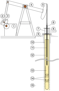 Das Bild der meisten Ölfelder wird von Gestängetiefenpumpen - wegen ihres Aussehens auch "Pferdekopfpumpen" genannt - geprägt. Dabei befindet sich der eigentliche Pumpenmechanismus - ein Kolben mit Rückschlagventilen - in einem eigenen Rohrstrang im Bohrloch nahe der Öl führenden Schicht. Der Kolben wird mittels einer verschraubbaren Stange von einem an der Erdoberfläche befindlichen Pumpenbock in eine kontinuierliche Auf- und Abbwegung versetzt. Der Zyklus beträgt üblicherweise 2,5 bis 12 Hübe pro Minute. Gestängetiefpumpen sind jedoch nur bis Tiefen bis etwas mehr als 2500 m wirtschaftlich einsetzbar, da sonst das Gewicht der zu hebenden Flüssigkeitssäule zu hoch wäre.