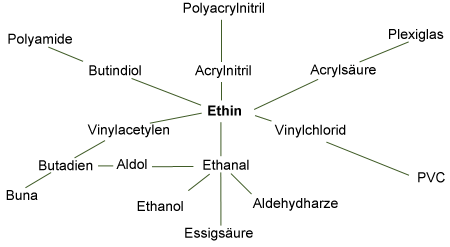 Im Kapitel über das Ethen wurden wichtige Additions-, Substitutions- und Polymerisationsreaktionen beschrieben, die Ausgangsstoffe für Produkte liefern, die im täglichen Leben eine herausragende Rolle spielen. Noch vor wenigen Jahrzehnten nahm das Ethin diese Rolle allein ein, da es anders als das Ethen zusätzliche wichtige Additionsreaktionen zeigte.