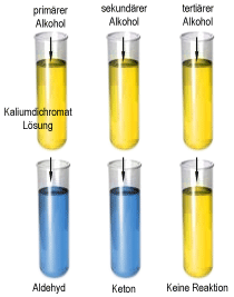 Wenn man Oxidationsmittel mit den verschiedenen Alkoholen zusammenbringt, lassen sich unterschiedlichen Eigenschaften im Experiment leicht nachweisen. Primäre Alkohole, beispielsweise Ethanol und Propanol-1, werden leicht zu Aldehyden oxidiert. Wenn man sekundäre Alkohole oxidiert, erhält man Ketone: