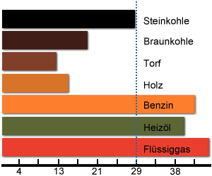 Die Grafik in Bild 1 zeigt, dass Erdölprodukte die höchsten Heizwerte erzeugen. Unter Heizwert versteht man die Wärme, die bei der vollständigen Verbrennung einer bestimmten Menge (1 kg oder 1 m3) eines Brennstoffes entsteht. Angegeben wird der Heizwert in Kilojoule pro Kilogramm, Gramm oder Tonne. Als Vergleich zieht man in der Technik gelegentlich noch die Steinkohleeinheit ( = SKE) heran.