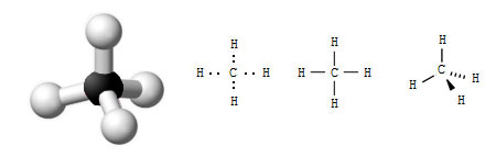 Die Wasserstoffatome im Methanmolekül sitzen also in den Ecken dieses Tetraeders. Der Winkel von Wasserstoffatom zum Kohlenstoffatom ist ein idealer, immer gleicher Tetraederwinkel und beträgt 109,5°. Der räumliche Aufbau des Moleküls wird jedoch oft nicht berücksichtigt und nur vereinfacht dargestellt (Bild 1).