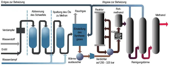 Bis zu diesem Zeitpunkt wurde Methanol nur durch trockene Destillation von Holz gewonnen. Damit war neben Ammoniak ein weiteres Grundprodukt der industriellen Chemie durch Hochdruckverfahren zugänglich. Die Methanolherstellung lässt sich in die Schritte Synthesegasherstellung, Roh-Methanolherstellung und Aufarbeitung des Roh-Methanols unterteilen (siehe Schema unten). Das Synthesegas kann aus einer Reihe verschiedener fossiler und nachwachsender Rohstoffe wie Kohle, Braunkohle, schweren Erdölfraktionen, Müll, Torf, Holz, Biogas oder Klärschlamm gewonnen werden.
