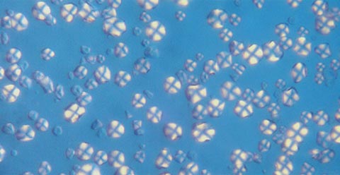 Diese Stärkekörner besitzen, je nach Pflanzenart, eine unterschiedliche Größe und Form. Sie können kugelig, oval, linsen- oder spindelförmig aussehen. Manchmal finden sich mehrere Körner zu einem abgerundeten Ganzen zusammen (zusammengesetzte Stärkekörner). Die Blaufärbung von Stärke durch Iod-Kaliumiodid-Lösung (oder im Laborjargon Iod-Iodkalium) ist eine empfindliche Nachweisreaktion von Stärke (Iod-Stärke-Reaktion).